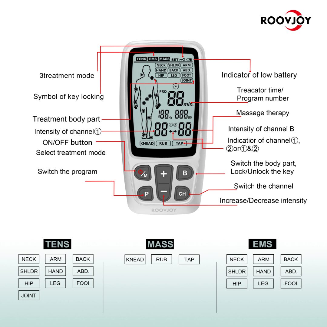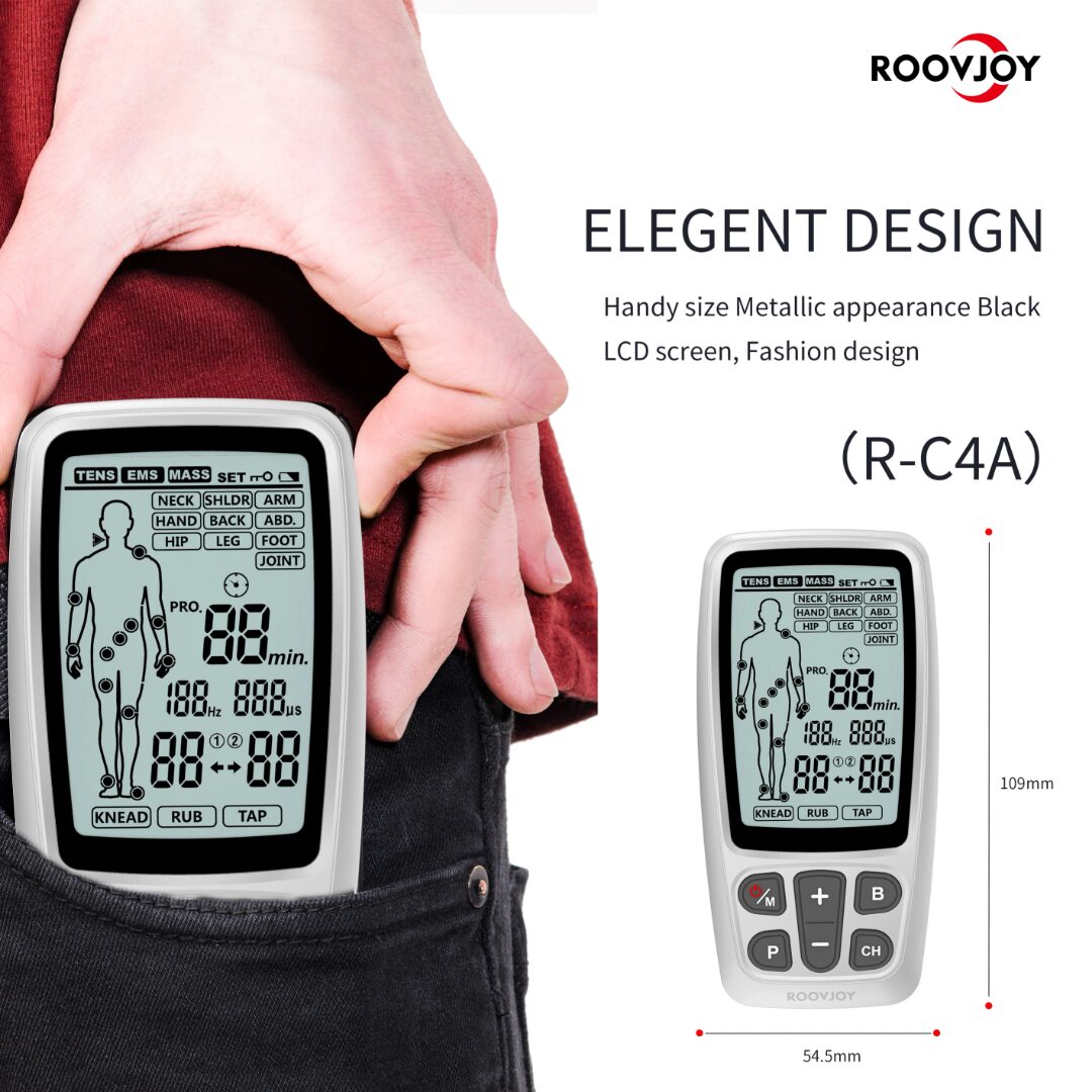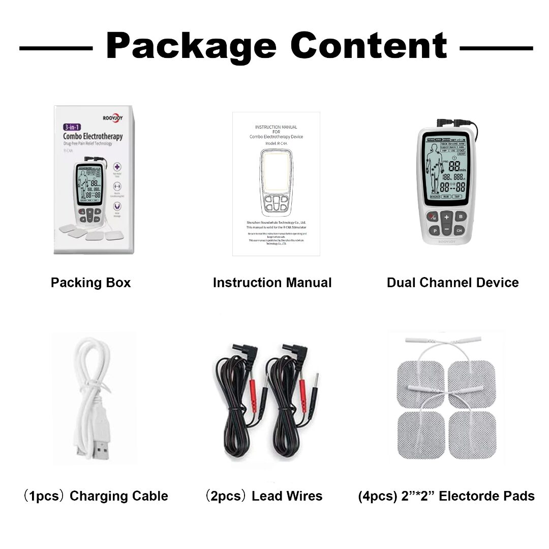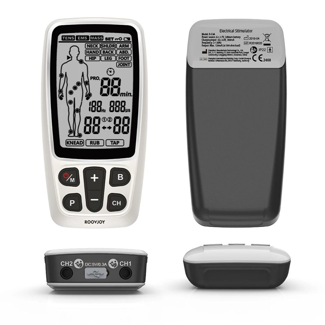 This Roovjoy 3-in-1 Electrotherapy Device (R-C4A) combines TENS (Transcutaneous Electrical Nerve Stimulation), EMS (Electrical Muscle Stimulation), and Massage in one compact, easy-to-use unit. Designed for pain relief, rehabilitation, muscle strengthening, and relaxation, it’s perfect for home therapy, clinics, or gyms.